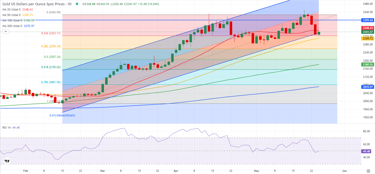 On the downside, immediate support is located at $2,320 (Fibonacci 23.6% retracement from the mid-April movement) before $2,310-$2,300 (50-day Simple Moving Average (SMA), psychological level) and $2,260 (Fibonacci 38.2% retracement).