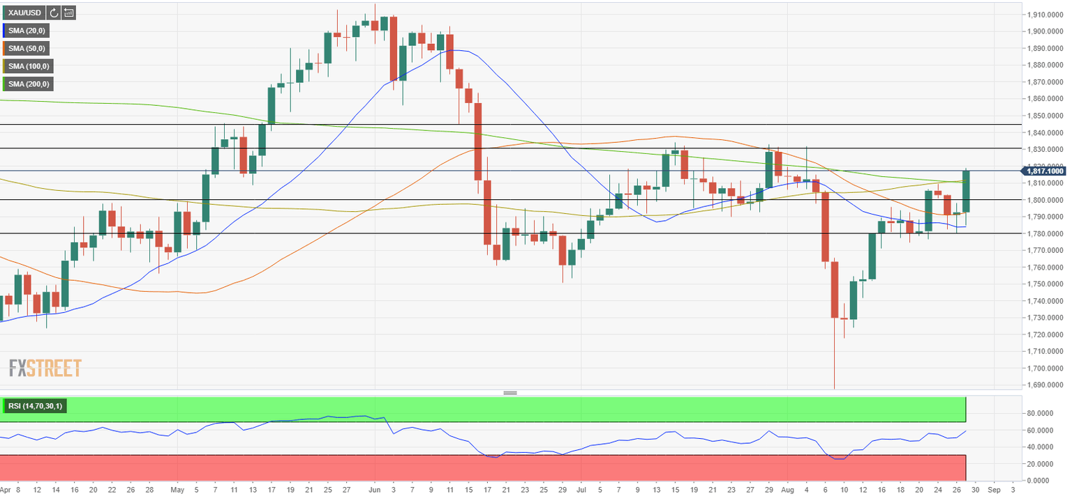 In the absence of high-tier data releases on Tuesday, the USD stayed on the back foot but gold failed to end the day in the positive territory after meeting stiff resistance above $1,800. On Wednesday, the US Census Bureau reported Durable Goods Orders in the United States declined by 0.1%, or $0.4 billion, to $257.2 billion in July. This reading came in better than the market expectation for a decrease of 0.3%. Nevertheless, investors showed little to no reaction to this report and rising US Treasury bond yields helped the greenback show some resilience against its major rivals.