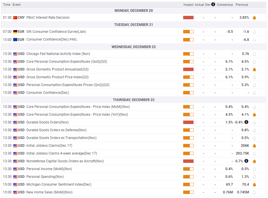 On Thursday, the Personal Consumption Expenditures (PCE) Price Index, the Fed's preferred gauge of inflation, will be looked upon for fresh impetus. On a yearly basis, the Core PCE Price Index, which excludes volatile food and energy prices, is expected to rise to 4.5% from 4.1% in November. Ahead of the Christmas break, market participants could ignore this inflation report since they already know what the Fed's plan to control price pressures look like.