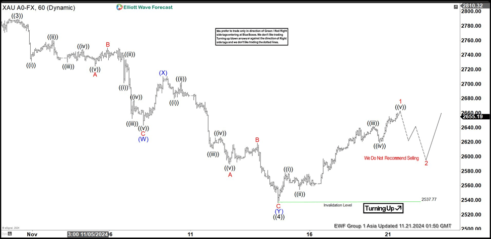 The metal has turned higher in wave ((5)). Up from wave ((4)), wave ((i)) ended at 2577.47 and wave ((ii)) pullback ended at 2554.34. The metal extended higher in wave ((iii)) towards 2641.92 and pullback in wave ((iv)) ended at 2618.7. Expect wave ((v)) of 1 to end soon and the metal to turn lower in wave 2 to correct cycle from 11.14.2024 low in 3, 7, or 11 swing before it resumes higher. Near term, as far as pivot at 2537.7 low stays intact, expect dips to find buyers in 3, 7, or 11 swing for further upside.