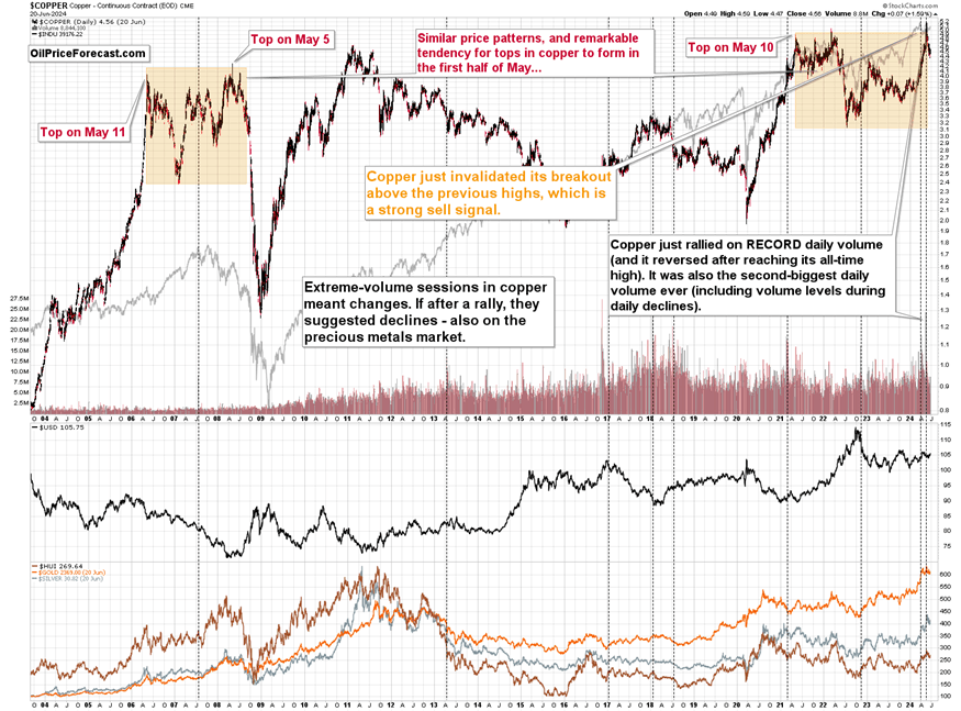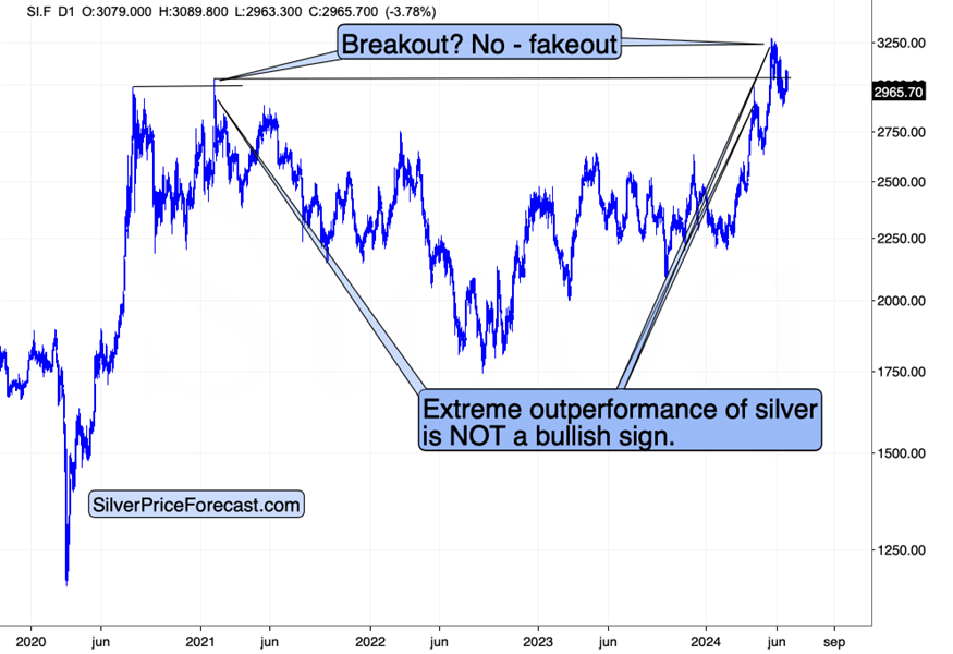 As silver invalidated its moves above the 2020 and 2021 highs, we saw very strong sell signal. Today’s invalidation of the rally is just a cherry on this extremely bearish analytical cake.