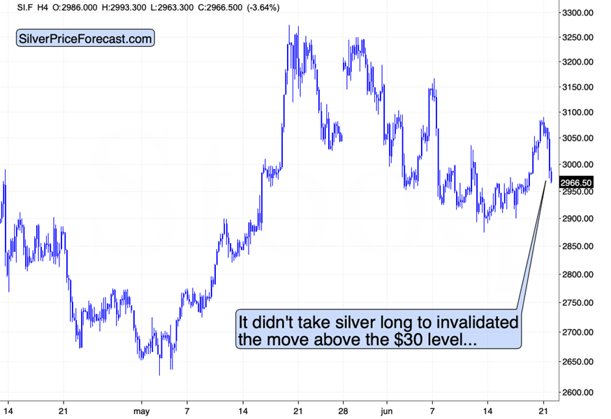 It surely didn’t take silver a lot of time to invalidate the move above $30. It was another fake rally – something that silver is known for, and something that I warned about.