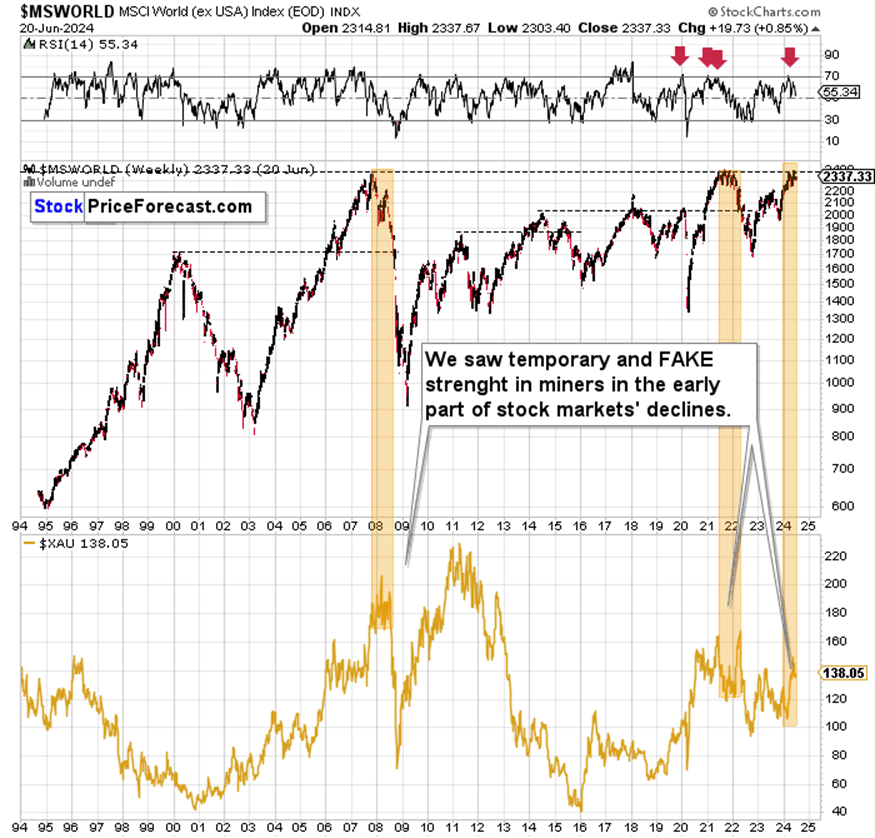Also, both previous cases when world stocks topped at those levels were followed by huge declines in the mining stocks.