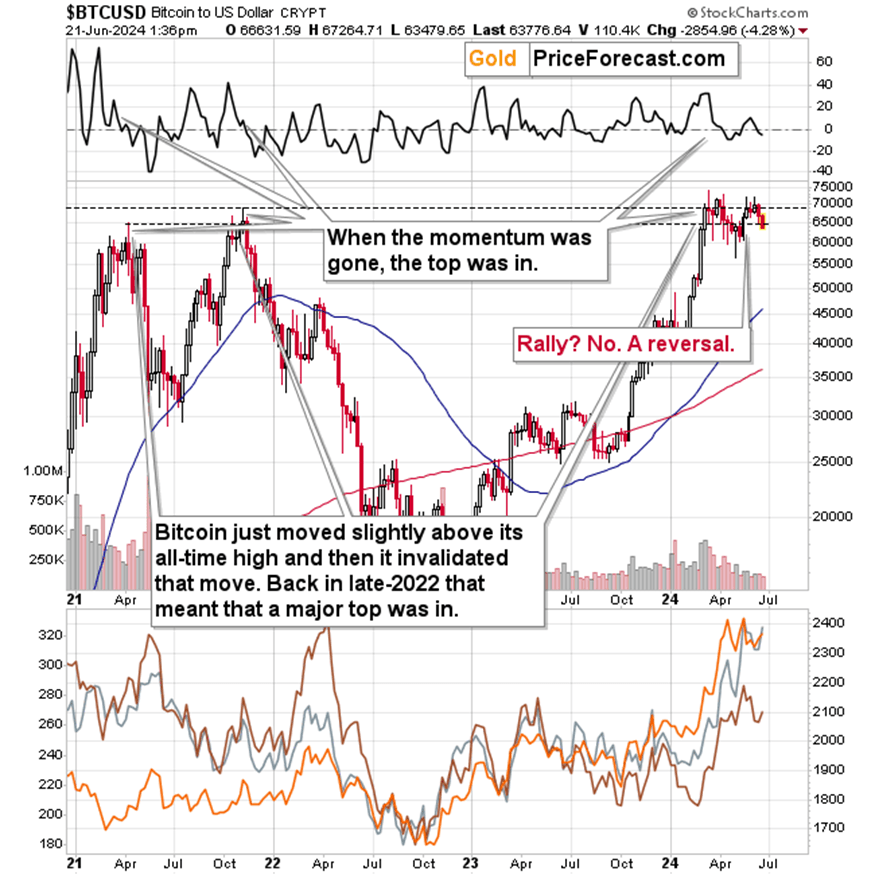 Bitcoin’s halving failed to ignite a rally to new highs. The “new gold” is below even its 2021 top. Ok, it’s not as weak as mining stocks, but it’s not how a really strong market behaves.