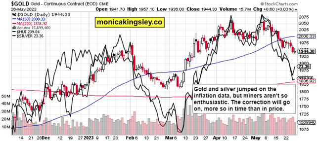 Gold with silver did catch some bid on inflation data with debt ceiling kicking the can down the road Friday advance hopes. Not only thanks to disinflation, the correction has to go further in time, but I remain bullish especially silver, and only then gold when it comes to year end closing prices – thanks to the return of inflation coupled with subpar growth, equals stagflation.