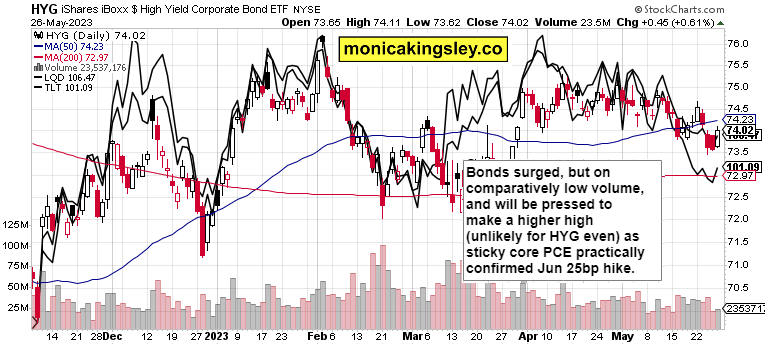 Pause in declining bonds indeed materialized, and would prove temporary and coinciding with the upcoming stock market top. For now, HYG would continue the slow appreciation path, supporting stocks during the remaining upside left. True, when the Jan-May period and the month of May isn‘t a down month, it then takes a while for the positive momentum in stocks to fizzle out, which is exactly what we‘re looking at entering Jun.