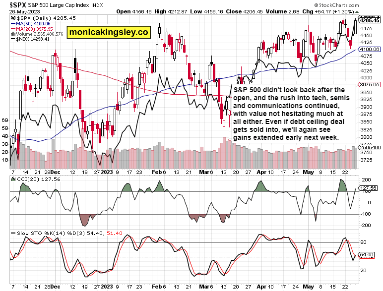 Not that it would decide the fate of this run aka hyped bull market – 4,275 is a logical target if you look at the weekly chart and consider late Apr setback‘s extension magnet for the buyers, which they aren‘t likely to break to the upside before the medium-term bearish factors and recession catch up.