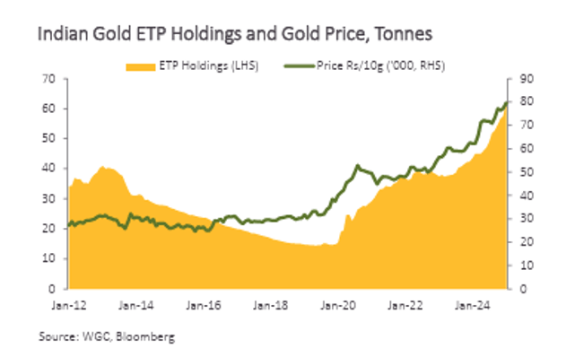 In tonnage terms, Indian ETFs increased their gold stocks by 4.6 tonnes, bringing total holdings to 62.4 tonnes.