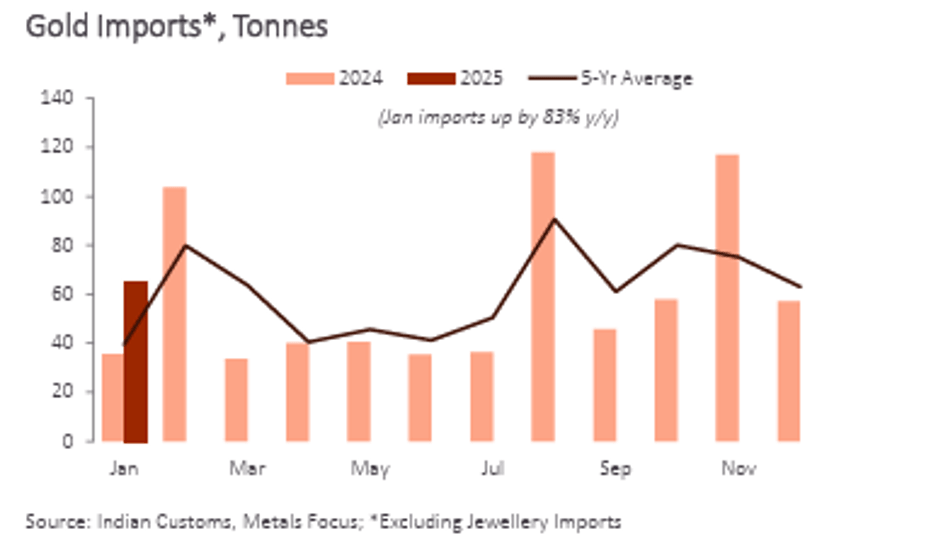 We also see investor interest reflected in India gold ETFs. Gold-backed funds reported “unprecedented” inflows of gold in January of $435 million. Over the previous 12 months, inflows had averaged around $112 million.