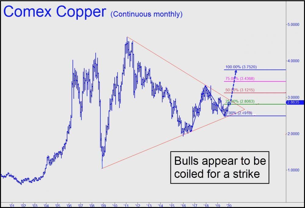 I’ve been a hardcore deflationist for so long that it took a wake-up call from the always astute Jesse Felder to jolt me out of my complacency. His latest report is headlined Dr. Copper Could Soon Deliver a Diagnosis of Inflation, and it’s an eye-opener. The chart accompanying Felder’s think-piece suggests that copper futures have been developing thrust for the last several years that could launch a steep rally. Felder uses a pennant formation to show this, and the breakout point on his chart would come at around $2.95 per pound if it occurs this month. I have illustrated his pennant in the chart above with red lines.