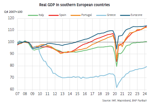 During the post-sovereign debt crisis period, i.e. from 2014, Italy’s real GDP grew significantly more slowly than Spain’s and Portugal’s. In the end, it took until the post-Covid period for activity to finally take off, with average annual growth of 4.8% between 2021 and 20232, compared to 3.3% for the Eurozone. This recovery was driven by the rebound in private consumption and the Superbonus tax incentive scheme for energy-efficient building renovation, which has significantly stimulated construction investment3.