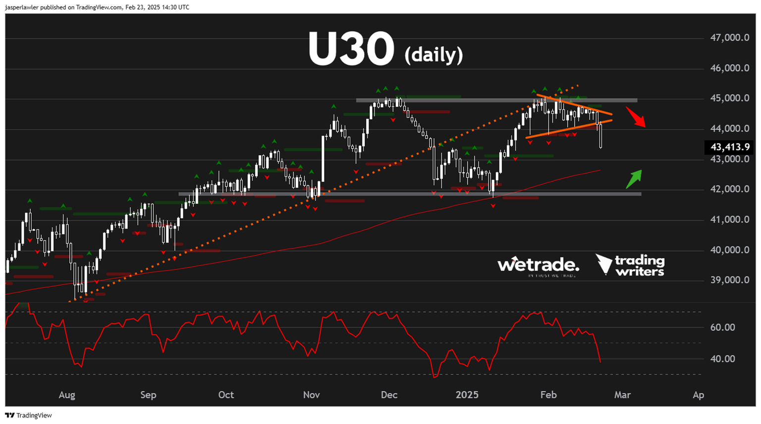 U30/USD - as traded on WeTrade’s trading platforms - has formed a double top pattern. For the pattern to complete, the price would need to break below 42000.