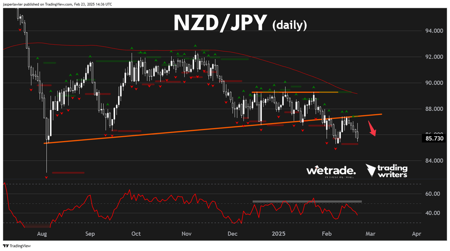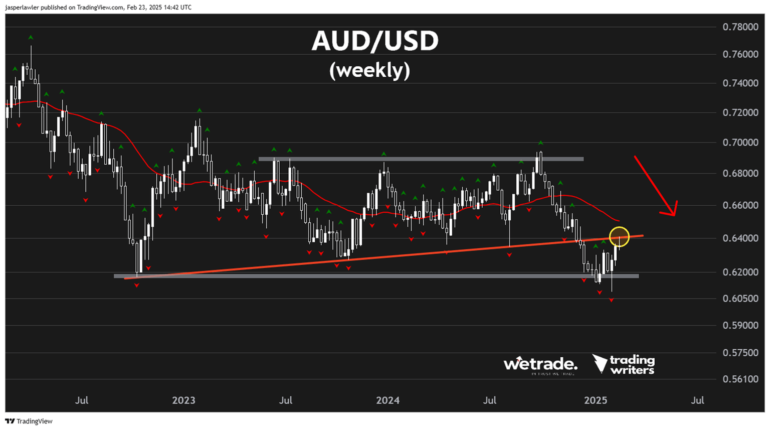 The Aussie dollar pair ended flat last week, but what caught our eye was the pullback away from the long term broken uptrend line, which we last alluded to back in week 53 2024. We have circled this in yellow.