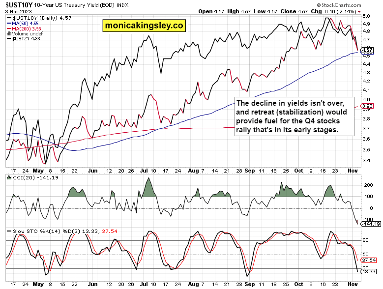 That‘s the big picture view – before getting carried away, keep in mind that soft landing hopes will prove not to have been vanquished – just look at rising job openings, construction growth, still strong consumer balance sheets and wage growth. The Treasury debt issuance Q4 projections so embraced by the markets is but one helpful tool to calm bond markets… Just wait for upcoming CPI mid Nov to prove my sticky inflation point as the effect of rising oil prices has far from played out.