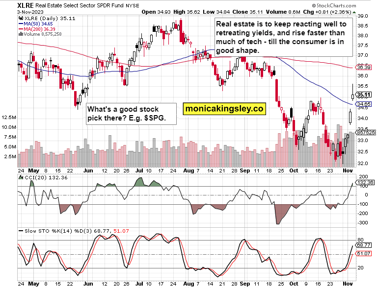 How about sectors – would it compare against tech or semiconductors? Yes, those interest rate sensitive ones would outperform in the current paradigm shift. XLE isn‘t staging a breakdown here, and together with XLK and select financials, would form a good portfolio part for the Q4 rally unfolding.