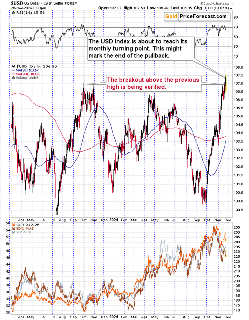 Additionally, while the price of gold invalidated its breakouts, the USD Index – quite surprisingly – didn’t.
