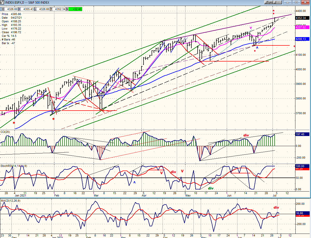 A few weeks ago, I thought that, based on its March ‘20 base P&F pattern, SPX could go to 4350. However, after seeing the degree of weakness in DJIA when it dropped into its short-term cycle low, I kept the likely projection price target at 4310. On Friday, driven by a possible climactic move in NDX, SPX reached an all-time high of 4355.43 and closed at 4352.34 but shows no confirmation of having struck a high point -- although that could come early next week.