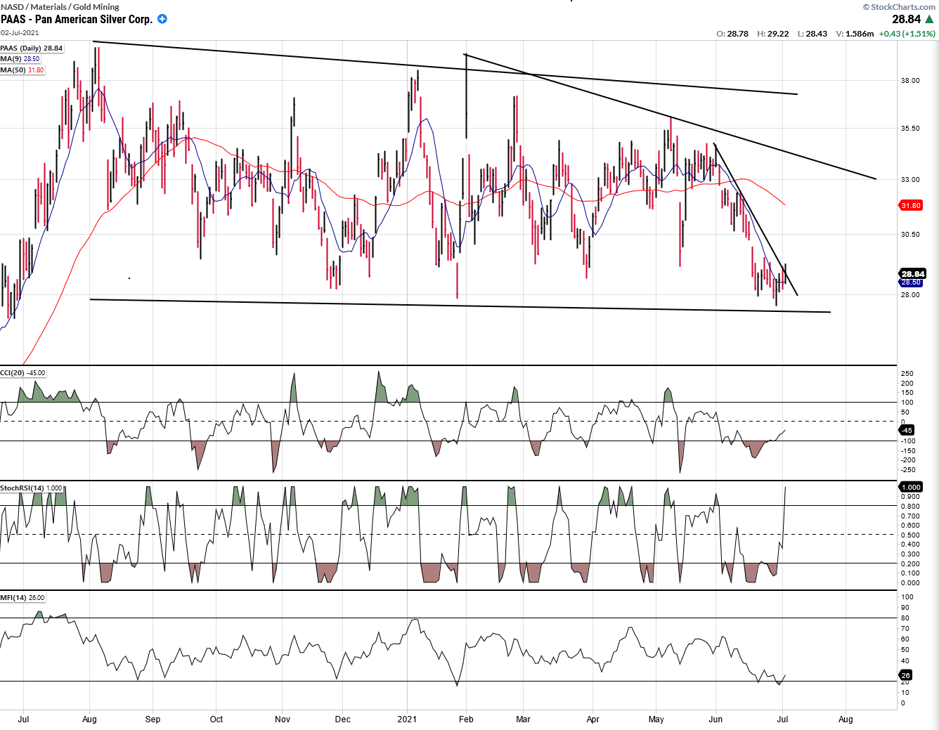 PAAS is following GDX -- or vice-versa. Short-term patterns for both are almost identical and should produce the same results. PAAS may have a small P&F advantage, having already had a couple of one-point reversals.