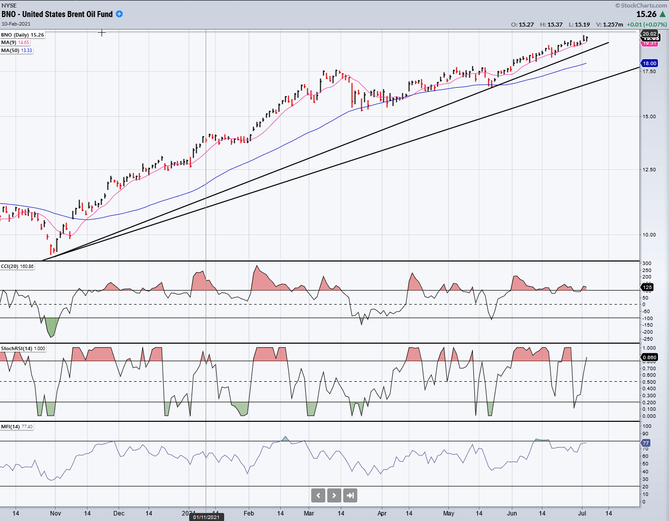 BNO is beginning to show signs of topping in its indicators. It will have to break below the top trend line, or at least below the shorter MA to start a correction.