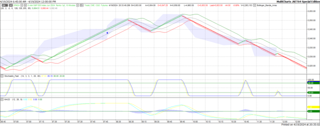 On Friday the ZN migrated Lower at around 8:15 AM EST as the S&P hit a Low at around the same time. If you look at the charts below the S&P gave a signal at around 8:15 AM and the ZN started its Downward slide. Look at the charts below and you'll see a pattern for both assets. S&P hit a Low at around 8:15 AM and migrated Higher. These charts represent the newest version of MultiCharts and I've changed the timeframe to a 15-minute chart to display better. This represented a Short opportunity on the 10-year note, as a trader you could have netted about a dozen ticks per contract on this trade. Each tick is worth $15.625. Please note: the front month for both the ZN and the S&P are now Jun '24. I've changed the format to filled Candlesticks (not hollow) such that it may be more apparent and visible.