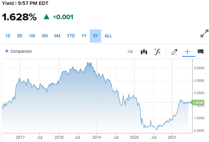The 10-year return has more than tripled from its August 4, 2020 low close of 0.515% and is up more than 70 basis points this year, finishing at 1.627% on Thursday. It remains far from its historical range between 2% and 3%.