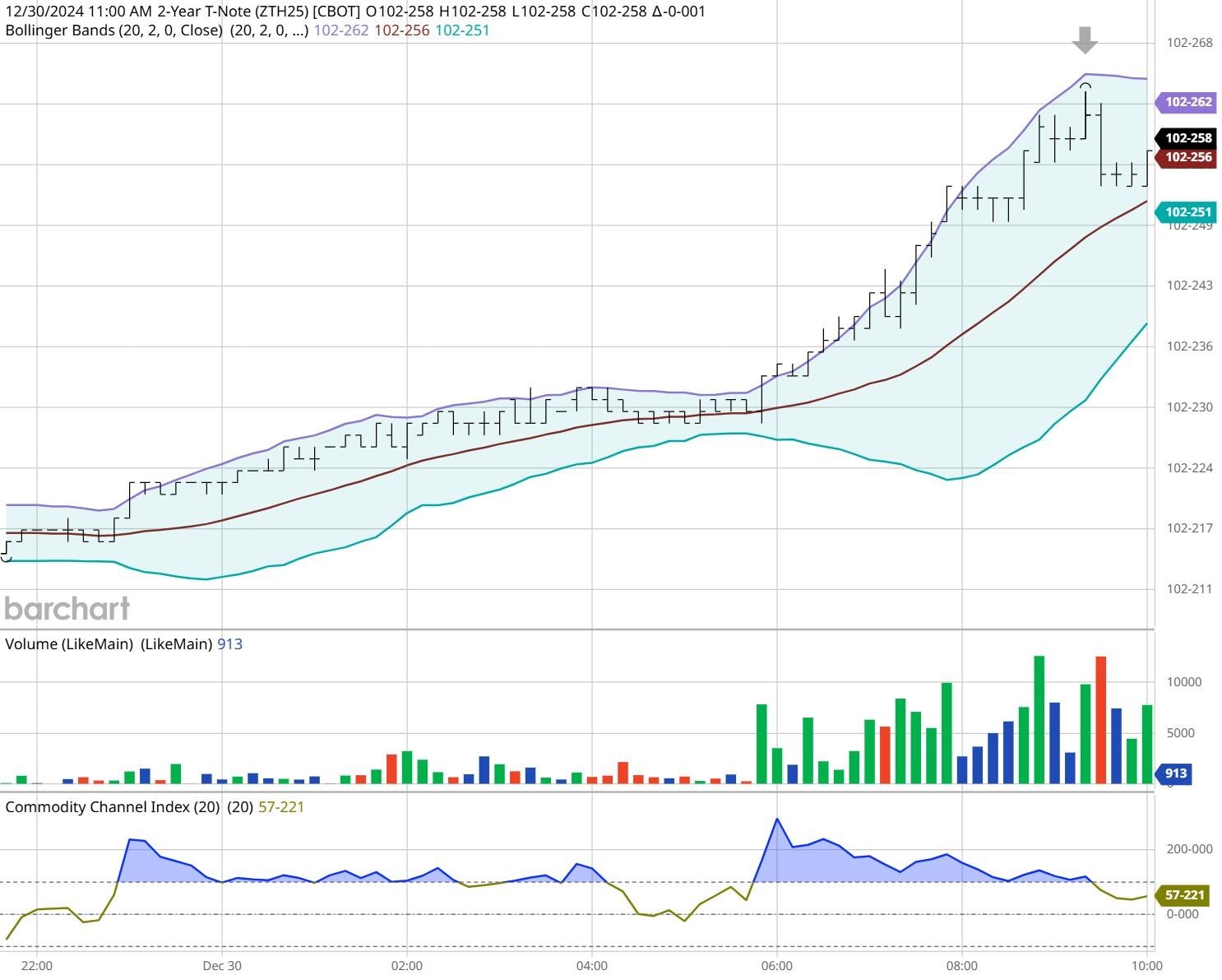 Yesterday the ZT migrated Lower at around 9:20 AM EST with no news in sight. The Dow climbed Higher at the same time. Look at the charts below and you'll see a pattern for both assets. The Dow moved Higher at 9:20 AM EST and the ZT moved Lower at around the same time. These charts represent the newest version of Bar Charts, and I've changed the timeframe to a 15-minute chart to display better. This represented a Short opportunity on the 2-year note, as a trader you could have netted about 10 plus ticks per contract on this trade. Each tick is worth $7.625. Please note: the front month for ZT is now Mar '25 and the Dow is now Mar '25. I've changed the format to filled Candlesticks (not hollow) such that it may be more apparent and visible.
