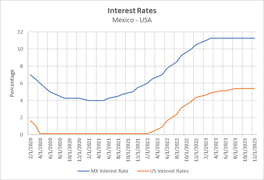 - USD/MXN to remain driven by the difference in interest rates set by Banxico and the Federal Reserve.