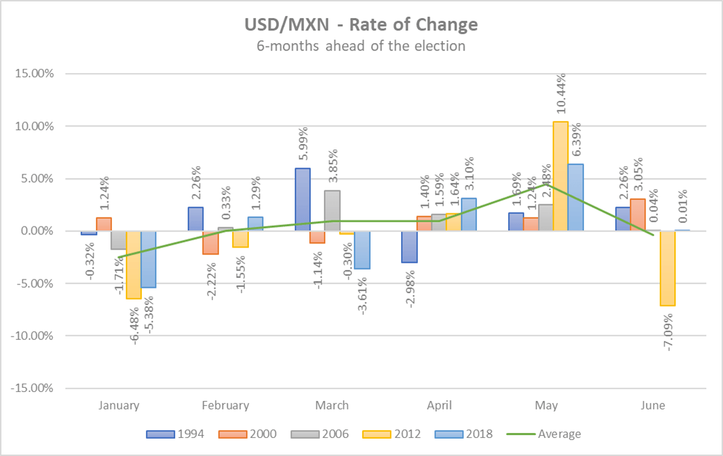 If the USD/MXN exchange rate finishes the year at around 17.00, here’s a projection based on the latest five elections in Mexico: