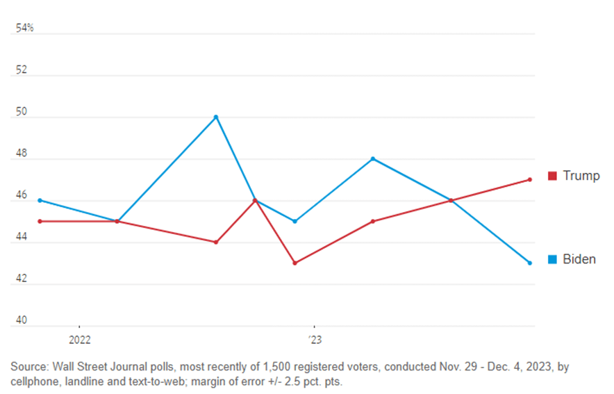 In 2024, Americans will elect a President and rejuvenate the US Congress. For the Democrats, the candidate would be President Joe Biden, whose approval rate has plummeted from 54% at the start of his presidency to 34%, according to a poll by Monmouth University. On the Republican side, former President Donald Trump leads the party and could also win the election, revealed by a Wall Street Journal poll that sees President Biden lagging Trump by 4%, 43% to 47%, on a hypothetical scenario featuring both candidates.