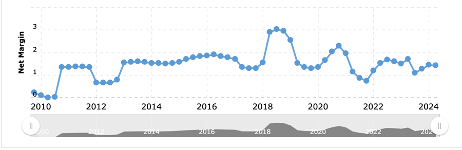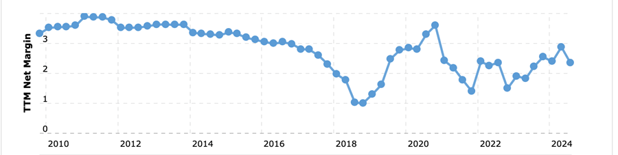 Here's Walmart's profit margin. It runs a little higher than Kroger because it is a hybrid grocer/general retailer. Nevertheless, its profit margin is also currently on the low side of the average.