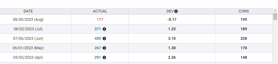 Arguably the most important release – at least the one most related to the Nonfarm Payrolls – came from ADP. America's largest payrolls provider reported an increase of only 177,000 jobs in August. While ADP revised its estimate for the previous month to the upside, the report seemed to point to a peak in July – and it may be all downhill from here.