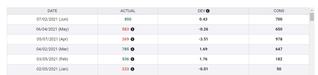 Since the outbreak of the COVID-19 crisis, the correlation between statistics published by America's largest payrolls company and official figures have been loose. In June, ADP came out with 692K and the NFP came out at 850K – a significant undershoot. In May, the firm reported a blockbuster 978K level while government statistics came out with only 559K, un undershoot.