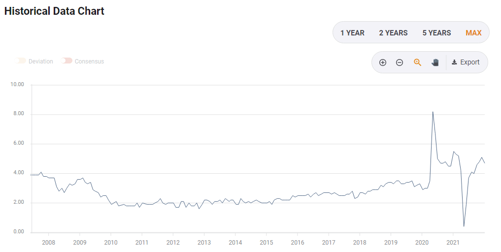 The economic calendar is pointing to an increase from 4.7% to 5.2% in yearly wages, and a faster increase cannot be ruled out.