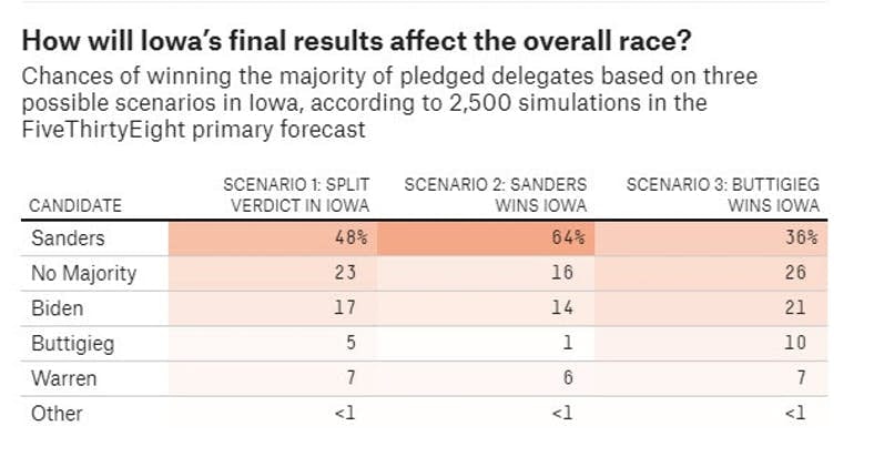 Silver is looking at past history while concluding "Sanders’s chances would be 64 percent if he’s deemed the winner of Iowa, but only 36 percent if Buttigieg is instead. Buttigieg’s majority chances, on the other hand, would be 10 percent if he wins Iowa — again, keep in mind how much ground he has to make up in more diverse states — but just 1 percent if Sanders wins outright."
