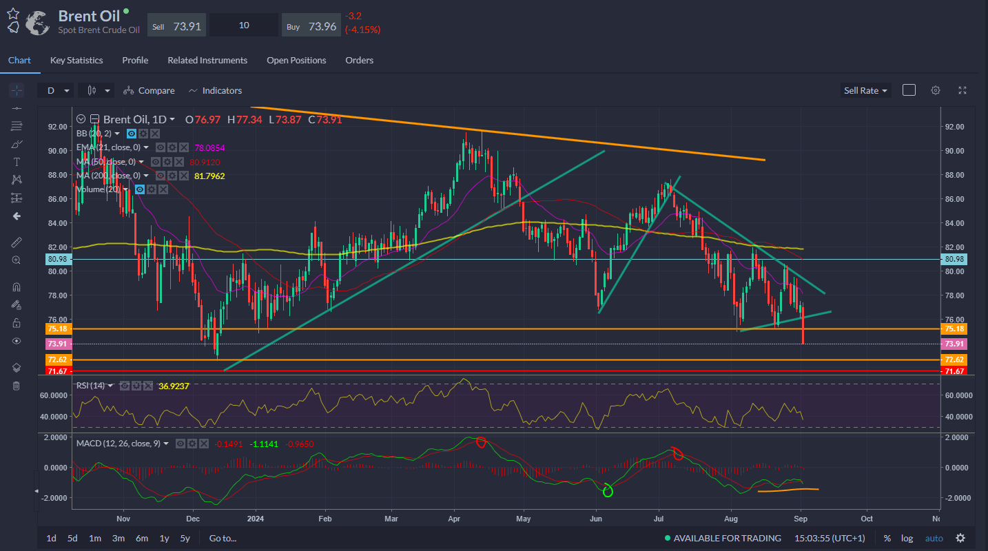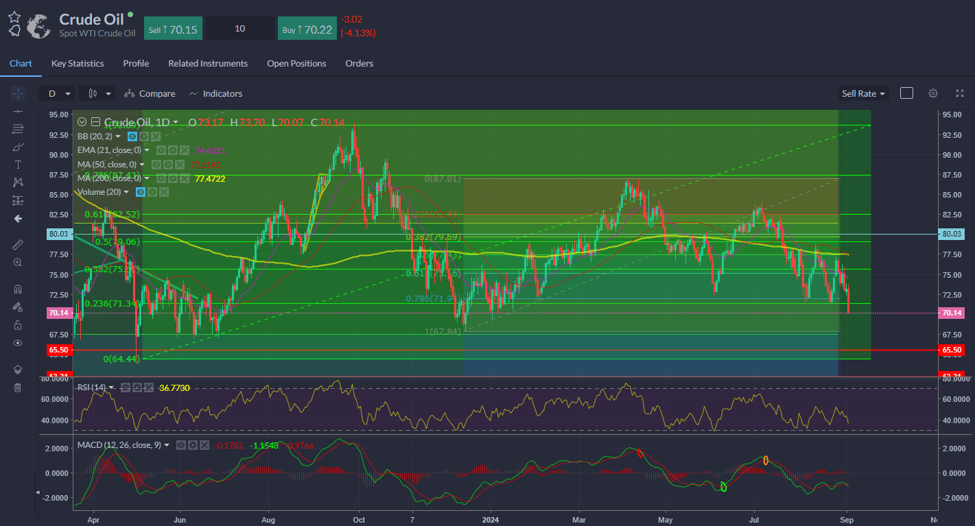 It’s not the best start to September for just about everything. Oil cracked at the bottom of the recent range to hit its lowest level the Dec ‘23 trough on a double whammy of growth fears and reports of some of the lost Libyan output restarting. Spot Brent broke down at $75 support, whilst spot WTI cracked at the $71.30/40 area that formed the recent bottoms on the last big Fib support before we are into the May ‘23 lows around $67.50, the 50% retracement of the post-Covid rally. Much below that we are into 3-year lows.