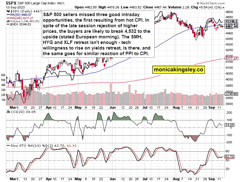 CPI came in hot, yet both yields and S&P 500 didn‘t maintain their downswings. The odds of Fed rate hikes weren‘t that much changed – speaking about both Sep and Nov, where a Nov hike is the underappreciated possibility, not a base case. The bears couldn‘t maintain the opening session‘s progress, and rotations had been actually quite good most of the session, proving the upswing being more than an intraday trap (as in longer lasting). Some traps take more than 24hrs to resolve.