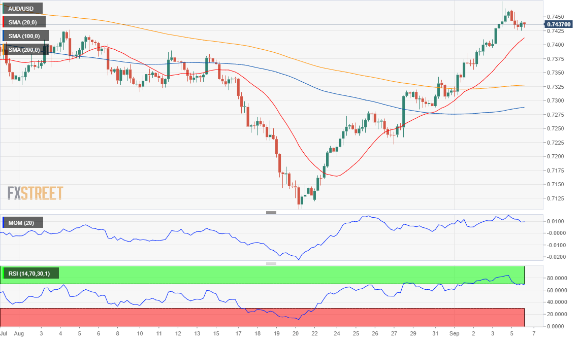 The AUD/USD pair retreated modestly from a multi-week high of 0.7477, holding above the 0.7400 figure and bullish, according to the daily chart. A dovish RBA is partially priced in, so chances of a steep decline are limited. Supports come at 0.7400 and 0.7370.