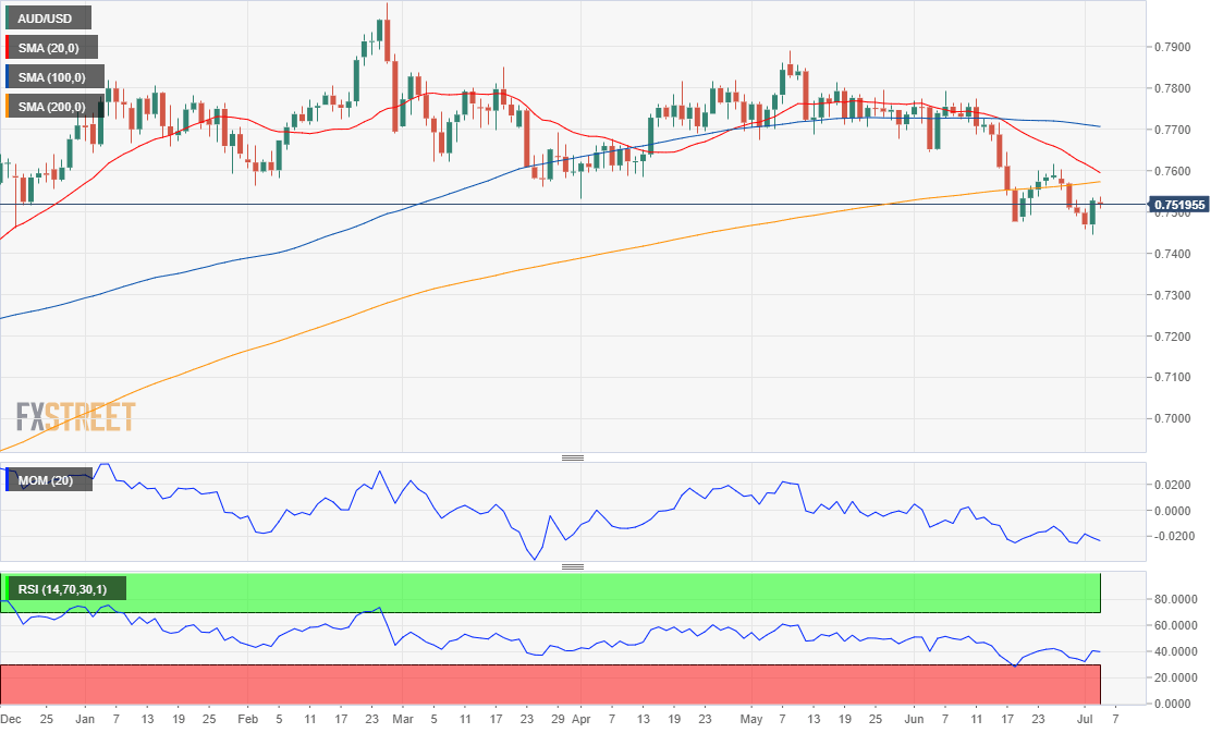 The AUD/USD is technically bearish, according to the daily chart. That means that a hawkish surprise will likely have a lesser impact on the pair than a dovish outcome from the RBA decision. In the mentioned time frame, the 200 SMA provides dynamic resistance at 0.7565, a probable bullish target in the case the aussie appreciates with the announcement. On the downside, the level to watch is 0.7480, as a steeper decline could be expected on a break below it.