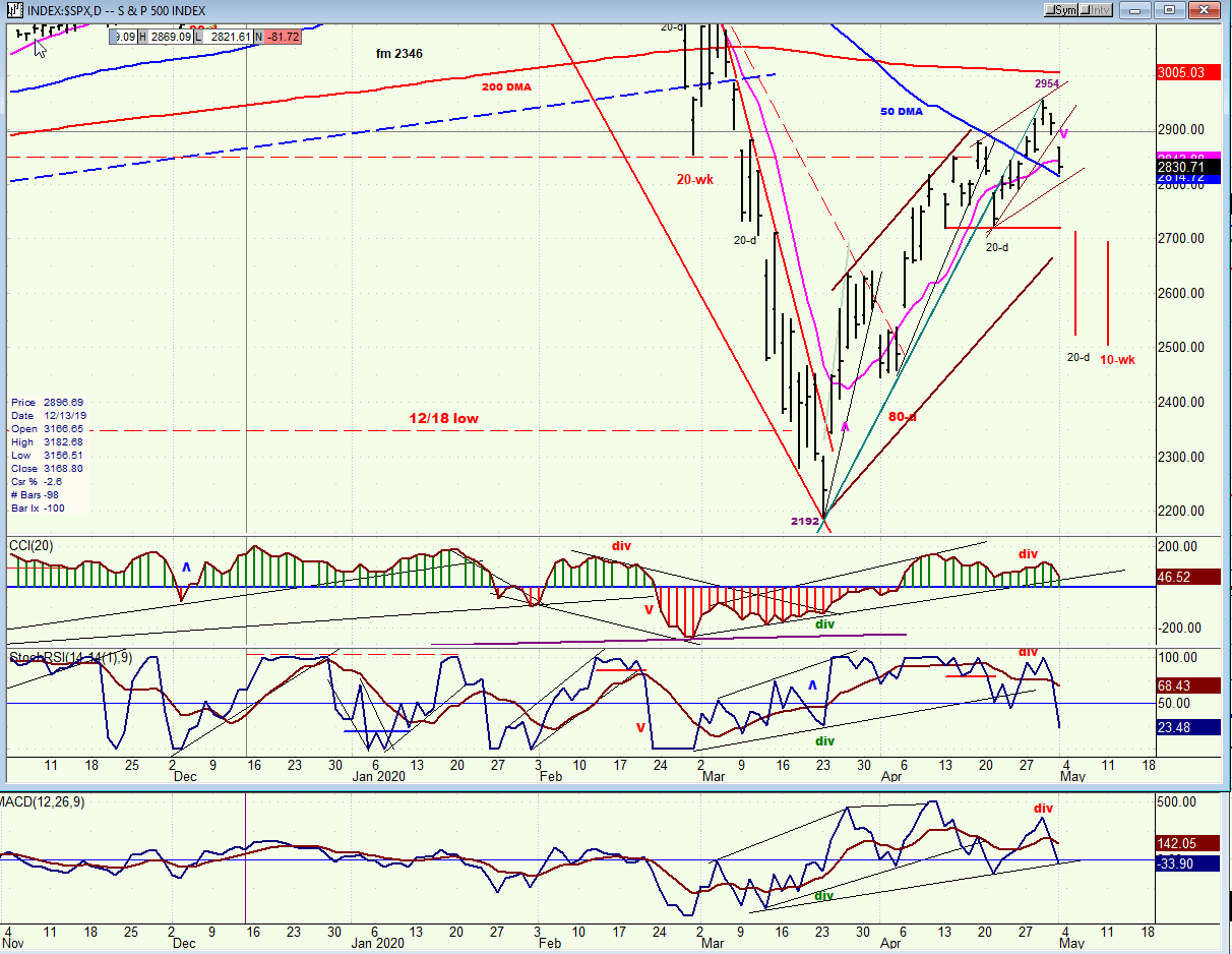 This reversal most likely puts an end to the 763-point bear market rally from mid-March and signals the start of the next phase of the downtrend which started from 3393. It is possible that after additional selling into next week, we could rally into about mid-May before the next reversal.