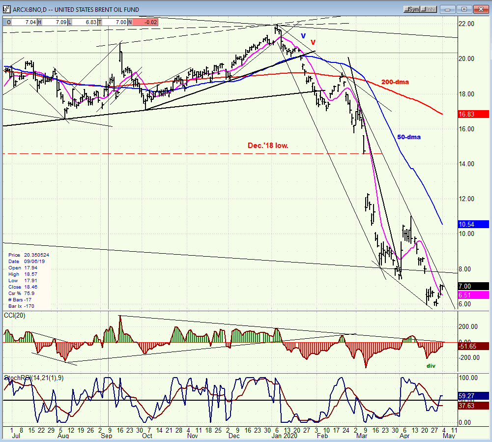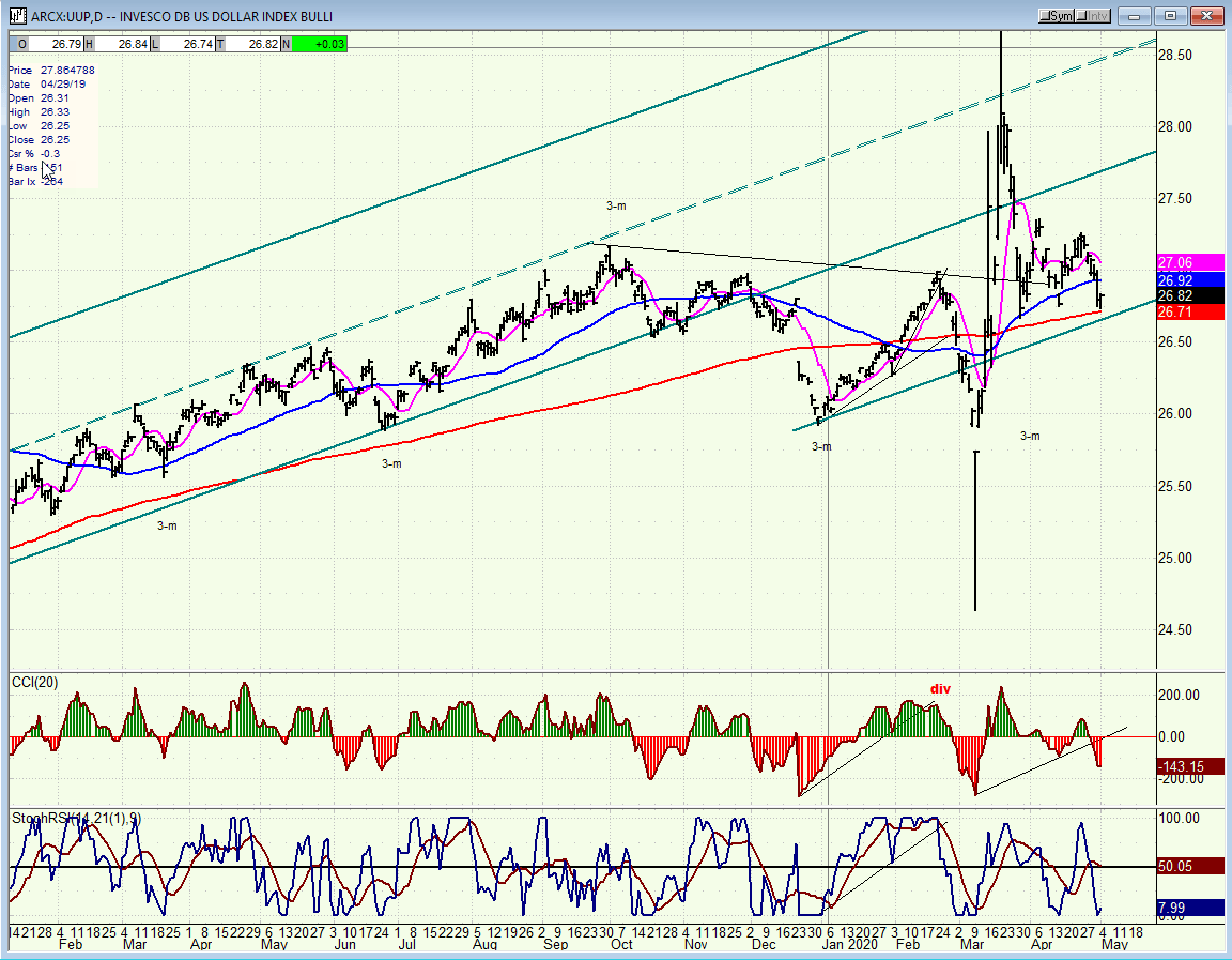 UUP has established a trading range above its 200-dma. Friday’s decline has taken it back down to it once again, and UUP must hold at this level or risk rolling over into the next 3-m low which does not come until the end of June.
