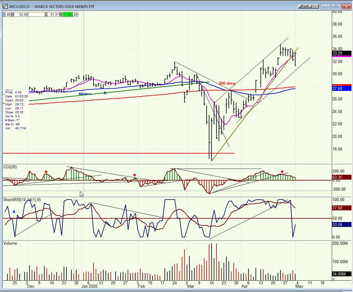 GDX needs to continue to rebound above 34, or risk correcting down to 28.50.