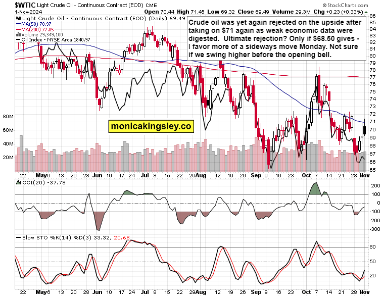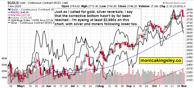 The pre-elections decline might continue and reach the target given fast – of course, geopolitics can turn that move around very fast, but breaking through $2,730s and going for the horizontal support given, is more probable than latest slide being one and done. If you remember the 2016 gold volatility on elections result catching the mainstream off guard, we have plenty to look forward for in the week ahead. I prefer waiting for a fresh long opportunity than forcing a short here, however probably successful that would be (this is analogical to my equities thinking).