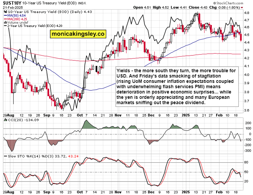 That was exactly the subject of the above Friday‘s second daily video – and the super extensive weekend one laying bare the drivers of Friday‘s (must watch) daily crash, macro landscape when Japan is coming back to the fore – let‘s thus compare currencies, Japanese and US yields, yield curve steepening, various commodities and metrics of volatility be it in the stock market or bonds – that‘s what Saturday‘s packed video is all about. In its final part, I compare the weekly S&P 500 chart to the daily one, presenting various supports and resistances, so make sure to watch it in full.