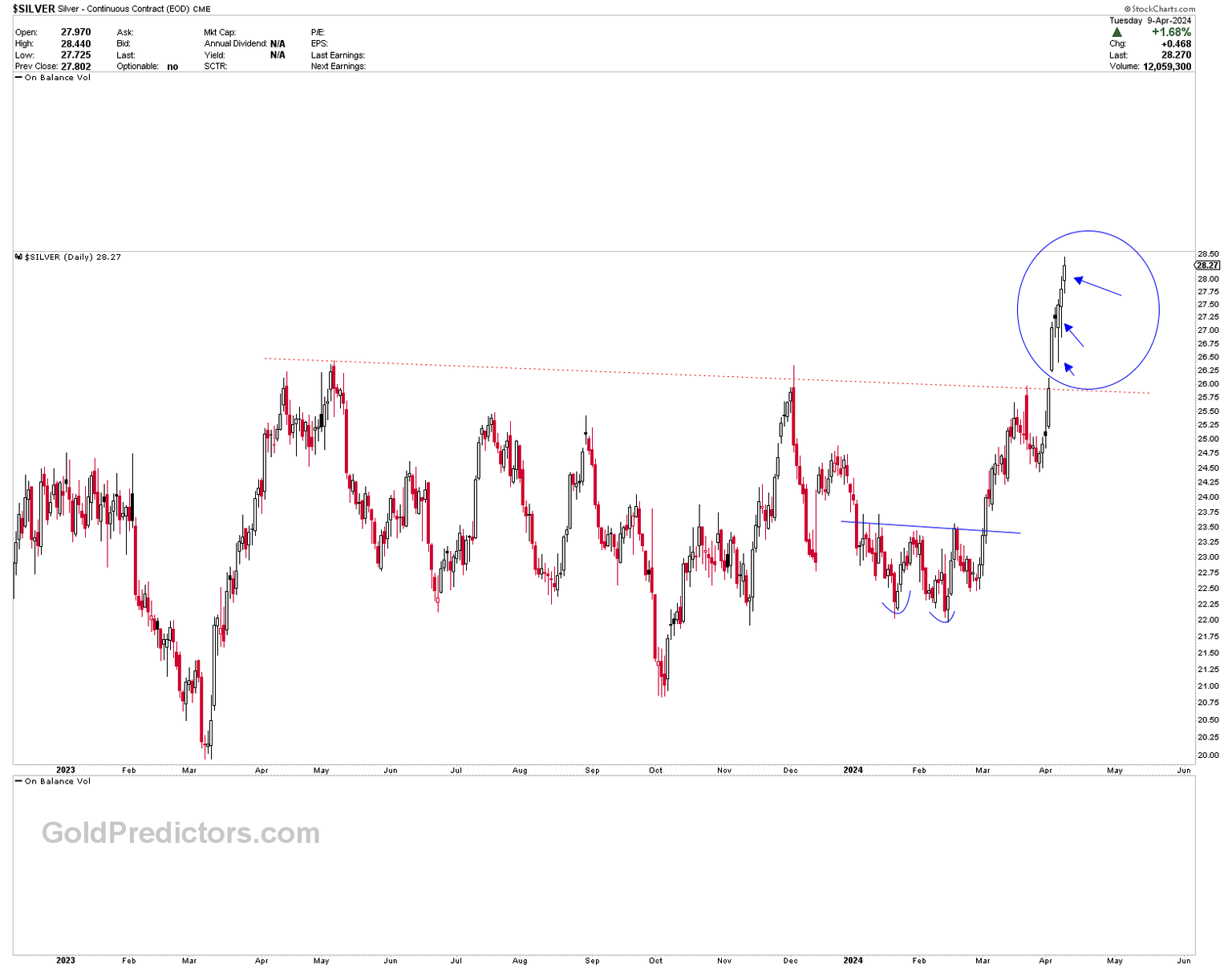 Silver, a metal of many facets, has illuminated the path to technological advancements and ecological sustainability. Its inherent properties make it indispensable in industries that uphold the highest reliability, precision, and safety standards. Silver’s role becomes increasingly pivotal as the world pivots towards greener energy and innovative technological solutions, profoundly influencing market dynamics. Based on the technical breakout, the silver is primed for surge.