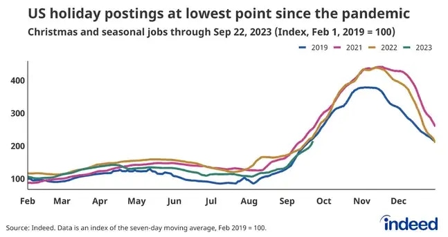 “For the first time in the post-pandemic era, the number of seasonal/holiday job postings on Indeed has fallen below pre-pandemic levels. As of late September, seasonal job postings were down 3% from the same time in 2019, and 6% below levels from the same period a year ago.”