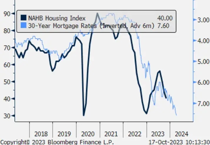 Furthermore, with economic pain hiding in plain sight, the crowds’ belief that higher long-term rates don’t matter should end in tears. For example, the National Association of Homebuilders (NAHB) released its Housing Market Index (HMI) on Oct. 17. The report stated: