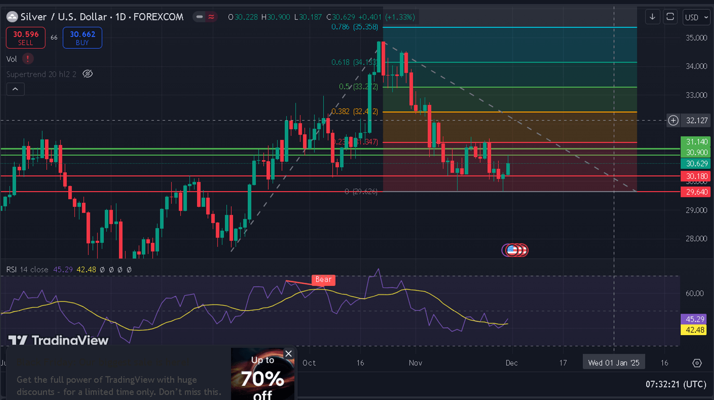 $30.18-$30.15: Immediate support zone; a breakdown may lead to $29.67-$29.64.