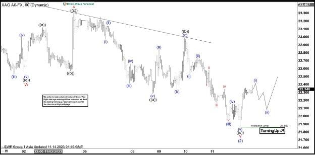 Silver (XAG/USD) cycle from 10.3.2023 low is in progress as an impulse. Up from 10.3.2023 low, wave (1) ended at 23.69 and pullback in wave (2) is proposed complete at 21.86. Down from wave (1), wave W ended at 22.52 and rally in wave X ended at 23.3. Internal subdivision of wave X unfolded as a zigzag structure. Up from wave W, wave ((a)) ended at 23.12, wave ((b)) ended at 22.57, and wave ((c)) ended at 23.3. This completed wave X in higher degree.