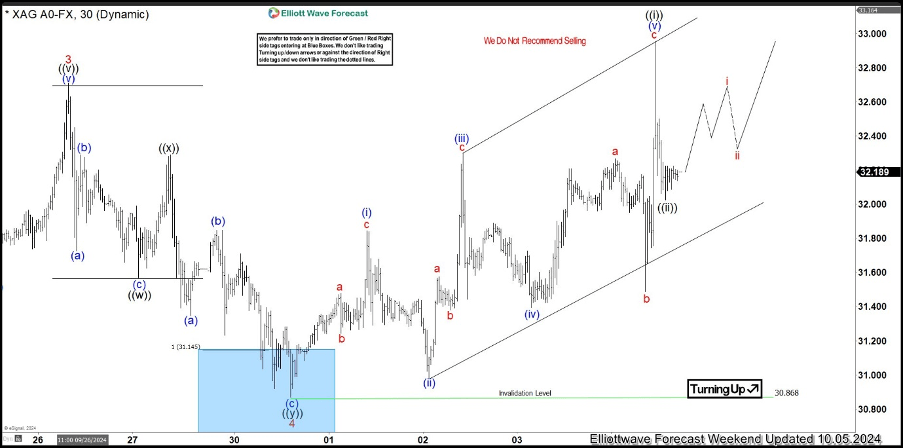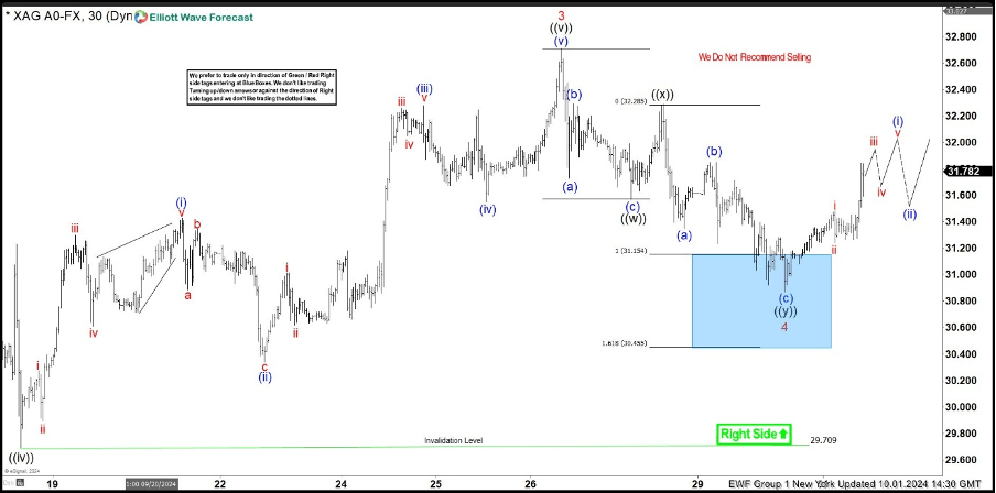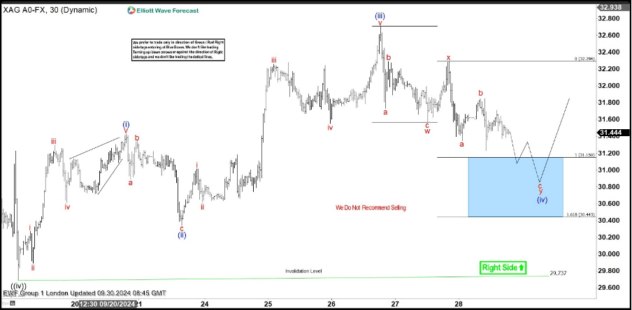 The commodity is giving us wave (iv) blue correction. The pull back has incomplete structure at the moment. Consequently, we are looking for another short term low toward the extreme zone (blue box). However, we don’t recommend selling it. We expect it to attract buyers at the Blue Box zone. The commodity could make either rally towards new highs or a larger corrective bounce in three waves at least. Once the bounce reaches the 50% Fibonacci retracement level against the connector high – x red, we’ll secure our position by moving the stop-loss to breakeven. Break below the marked invalidation level : 30.44 would invalidate the trade.