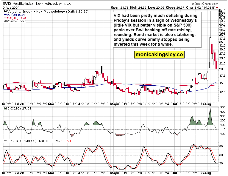 Instead of discussing market breadth and sectoral picks reserved for clients, let‘s feel the evolving bottoming process – including the rising S&P 500 and Nasdaq wedges watchouts – through the VIX and bond market lens. Remembering my Friday‘s words discussing Thursday – „the VIX declined in the end below not just 25, but also 24 – attesting to easing fear in the markets, all accompanied by steeply having risen spread between smart money and dumb money sentiment. Valuable clues.“ And the smart vs. dumb money indicator is one worth paying attention to from medium-term perspective.